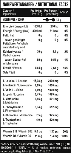 Ingrédients : Maltodextrine, L-Leucine, L-Lysine, L-Isoleucine, L-Valine, L-Thréonine, Acide citrique, L-Tryptophane, L-Phénylalanine, L-Méthionine, Arômes, Édulcorant (sucralose), Chlorhydrate de pyridoxine, Cyanocobalamine.