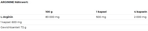 L'acide aminé L-arginine est un acide aminé avec la teneur en azote la plus élevée de tout le spectre des acides aminés et est un composant important des protéines complexes. Un apport adéquat en protéines assure le renouvellement et la croissance du muscle squelettique, à condition que l’équilibre azoté soit maintenu. Les athlètes choisissent ce produit principalement en raison de la synthèse d’oxyde nitrique (NO) et de la vasodilatation améliorée associée. La vasodilatation est la dilatation des vaisseaux sanguins, ce qui augmente le flux sanguin et améliore l'apport d'oxygène et de nutriments aux muscles, leur permettant de travailler avec une plus grande intensité.