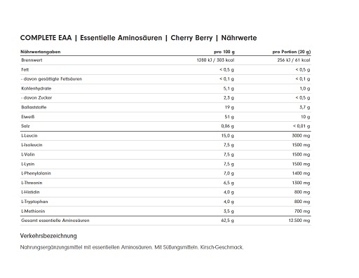 La poudre innovante COMPLETE EAA possède un profil complet d'acides aminés essentiels (y compris l'histidine), est dosée de manière optimale avec 12 500 mg d'EAA par boisson et contient 3 000 mg de leucine par portion, la quantité idéale et scientifiquement prouvée de leucine pour un entraînement efficace de fitness et de renforcement musculaire.