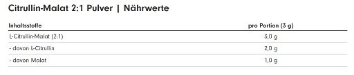 La poudre ProFuel Citrulline-Malate contient la combinaison efficace de l'acide aminé L-citrulline et du malate (sel d'acide malique) dans le rapport optimal 2:1. Une portion (3 g) fournit 2 g de L-citrulline et 1 g de malate. La citrulline est convertie en arginine dans le corps, augmentant ainsi la production d'oxyde nitrique (NO). Résultat : une relaxation des vaisseaux sanguins et donc une circulation sanguine optimale. Le malate, à son tour, optimise la production d’énergie avec l’oxygène, ce qui est la clé d’une performance accrue dans les sports d’endurance.