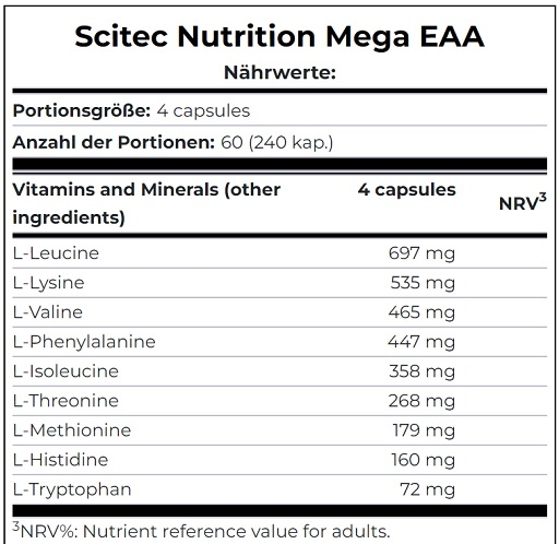 Mega EAAcontient tous les acides aminés essentiels dans les proportions recommandées par l'Organisation mondiale de la santé (OMS). Un apport correct en acides aminés essentiels est la clé d'une alimentation équilibrée. Mega EAA contribue à fournir à l'organisme tous les acides aminés essentiels au bon moment et dans les bonnes proportions.