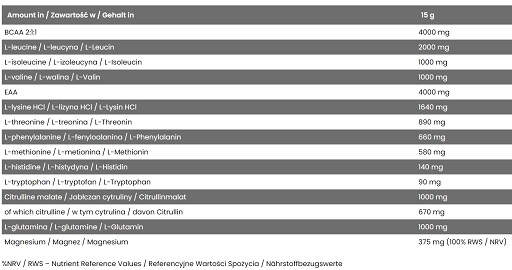 Une formule innovante de péri-entraînement contenant des acides aminés exogènes (EAA), des acides aminés à chaîne ramifiée (BCAA), de la L-glutamine et de la citrulline. Le dosage élevé des principes actifs contenus dans le produit et le rapport idéal d'acides aminés déterminent le bon flux des processus énergétiques dans le corps lors d'un effort physique très intense.