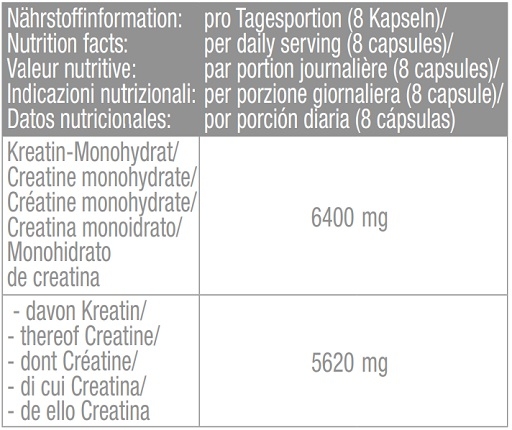 Créatine monohydrate (87 %), gélatine (enveloppe de la capsule (bœuf)), antiagglomérant (sels de magnésium d'acides gras), colorants (dioxyde de titane, oxydes de fer et hydroxydes de fer).
