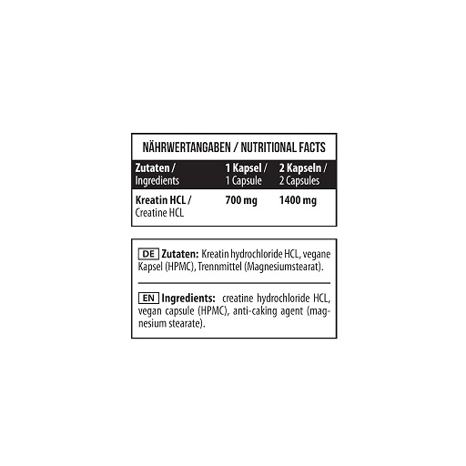Il a également été prouvé que lorsque la même quantité de créatine HCL et de créatine monohydrate est consommée, la créatine HCL est absorbée dans l'intestin environ 60 % mieux que la créatine monohydrate. Cela permet de prendre une dose beaucoup plus faible de créatine HCL pour obtenir des résultats similaires à ceux du monohydrate de créatine.