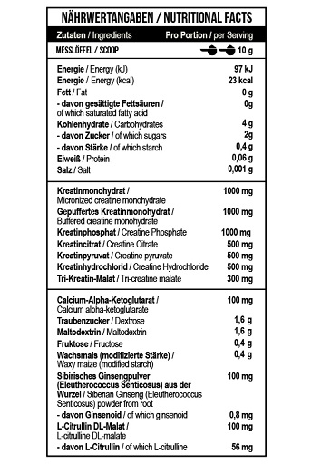 La créatine est de loin l’un des compléments nutritionnels les plus populaires et les plus efficaces pour développer les muscles et fournir un puissant boost de performance pour votre entraînement. Cela a été prouvé scientifiquement à plusieurs reprises : la créatine augmente les performances physiques lors d'un entraînement de force explosive dans le cadre d'une activité physique intense et de courte durée (avec un apport quotidien d'au moins 3 g !). Notre corps ne peut supporter un effort intense que pendant une courte période, car l’adénosine triphosphate (ATP), principale source d’énergie pour tous les processus métaboliques et l’effort physique, n’est stockée qu’en quantités limitées dans les cellules musculaires. Ces réserves s’épuisent en quelques secondes en cas de stress. Le MST Creatine KICK assure la resynthèse lors de stimuli musculaires courts et intenses et est utilisé pour restaurer l'ATP. La créatine peut soutenir la production d'ATP, permettant de maintenir des charges musculaires très élevées plus longtemps. Mais ce n'est pas tout : des études ont prouvé que le ginseng sibérien utilisé ici avait également une influence positive sur le métabolisme de l'ATP !