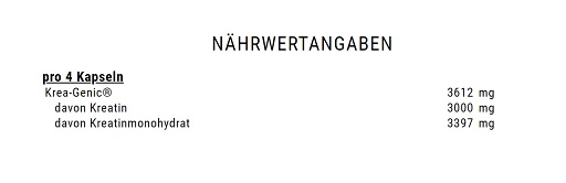 Krea-Genic® (Créatine monohydrate, correcteur d'acidité : E500), hydroxyméthylcellulose (enveloppe de la capsule), agent de charge : E460 ; Antiagglomérants : E551, E470b. Peut contenir des traces de lait, de gluten, de soja et d'œuf.