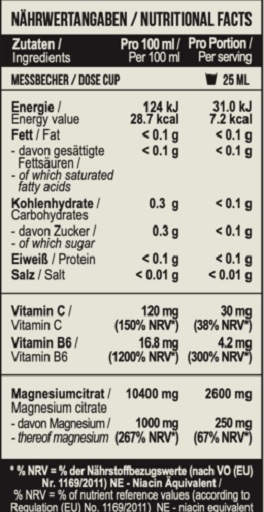 Eau, citrate de magnésium, arôme, acidifiant (acide lactique), acide L-ascorbique, poudre de griotte (0,35%), conservateur (sorbate de potassium), édulcorants (cyclamate de sodium, acésulfame K, saccharine), chlorhydrate de pyridoxine. En raison des ingrédients naturels, des changements de couleur et de légères modifications de saveur peuvent survenir pendant le stockage ; cela n'affecte pas la qualité du produit.