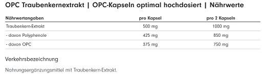 Une gélule (portion quotidienne) contient 500 mg d'extrait de pépins de raisin de haute qualité et apporte à l'organisme 425 mg de polyphénols, dont 375 mg d'OPC purs. Pour nos gélules OPC, nous utilisons un extrait de pépins de raisin blanc allemand de haute qualité, avec une teneur exceptionnellement élevée en OPC de 75 %, prouvée par la méthode HPLC précise. Les capsules OPC ne contiennent aucun additif et, grâce à leur enveloppe 100 % végétale, sont 100 % végétaliennes.