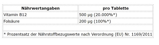 La vitamine B12 et l'acide folique sont étroitement liés dans notre métabolisme, donc une carence en vitamine B12 conduit indirectement à une carence en acide folique. VITAMINE B12 + ACIDE FOLIQUE contient donc non seulement de la méthylcobalamine, la forme de vitamine B12 de la plus haute qualité, mais également un dosage parfaitement équilibré d'acide folique bioactif (vitamine B9). Un comprimé quotidien de vitamine B12 + acide folique couvre de manière optimale la totalité des besoins quotidiens en vitamine B12 et en acide folique, apportant ainsi une contribution précieuse à un corps sain et efficace.