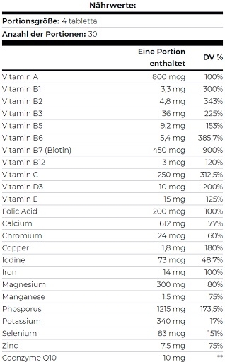 Phosphate dicalcique, phosphate monopotassique, agent de charge : cellulose microcristalline, oxyde de magnésium, acide ascorbique, agent d\'enrobage : talc, fumarate de fer (II), nicotinamide, acétate de DL-alpha-tocophéryle, antiagglomérants : stéarate de magnésium et dioxyde de silicium, sulfate de zinc monohydraté, sélénite de sodium, D-pantothénate de calcium, coenzyme Q10, sulfate de cuivre (II) pentahydraté, chlorhydrate de pyridoxine, riboflavine, sulfate de manganèse monohydraté, thiamine monohydratée, acide folique, D-biotine, acétate de vitamine A, vitamine B12, picolinate de chrome, iodure de potassium, vitamine D3.