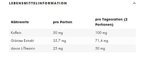 Maltodextrine, arôme, acides (acide citrique, acide malique), caféine, colorant (caramel au sulfite d'ammonium), édulcorants (sucralose, acésulfame K), extrait de thé vert (70% L-théanine).