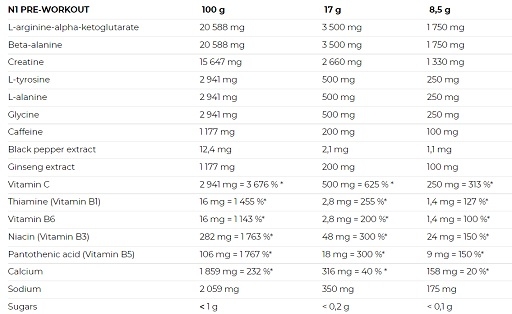 L-Arginine alpha-cétoglutarate, bêta-alanine, créatine monohydrate, inuline, phosphate de calcium, citrate de sodium, citrate de créatine, correcteur d'acidité acide citrique, acide L-ascorbique, L-tyrosine, L-alanine, glycine, chlorure de sodium, caféine, extrait de ginseng (5% de ginsénosides), arôme, mélange de concentré de betterave et d'extrait de spiruline, nicotinamide, concentré de carotte noire, édulcorants sucralose et glycosides de stéviol, antiagglomérant dioxyde de silicium, D-pantothénate de calcium, chlorhydrate de pyridoxine, chlorhydrate de thiamine, extrait de poivre noir (95% de pipérine) - Bioperine®. Le produit peut contenir des traces de protéines de soja et de lait. inclus.