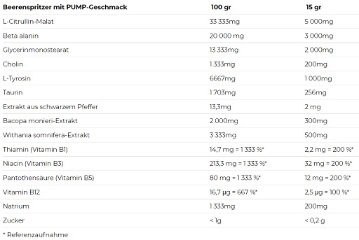 Malate de L-citrulline, bêta-alanine, monostéarate de glycéryle, L-tyrosine, taurine, antiagglomérant : dioxyde de silicium, L-bitartrate de choline, extrait de Withania Somnifera (5 % de withanolides), citrate de sodium, extrait de Bacopa Monnieri, chlorure de sodium, antiagglomérant : phosphate de calcium, arôme, édulcorants : sucralose et glycosides de stéviol, nicotinamide, D-pantothénate de calcium, chlorhydrate de thiamine, extrait de poivre noir (95 % de pipérine) - Bioperine®, colorant : bleu brillant FCF, cyanocobalamine. Peut contenir des traces de protéines de soja et de lait.