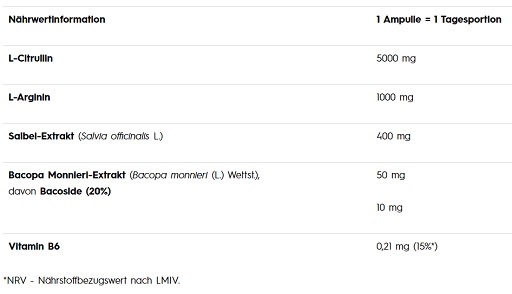 Eau, L-citrulline, chlorhydrate de L-arginine, correcteur d'acidité acide citrique ; Arômes, extrait de feuille de sauge (Salvia officinalis L.), extrait d'herbe de petite grassette (Bacopa monnieri (L.) Wettst.), épaississant carboxyméthylcellulose sodique ; Édulcorants sucralose, acésulfame K ; Conservateur acide sorbique; colorant carotène; Chlorhydrate de pyridoxine – Vitamine B6.