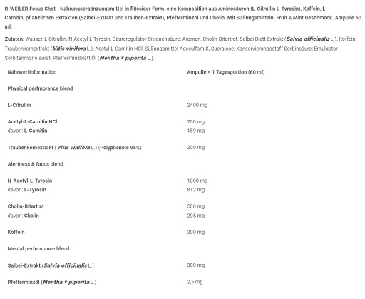 La petite ampoule conviviale de R-WEILER Focus Shot est une combinaison innovante d'un produit de pré-entraînement (mélange de : citrulline, acétyl-L-carnitine, extrait de pépins de raisin) avec des nootropiques de plus en plus populaires - ce sont des ingrédients tels que la caféine qui contribuent à la promotion des fonctions perceptives (fonction cognitive), notamment la mémoire, la vitesse de stockage, la concentration, la créativité et la pensée logique.