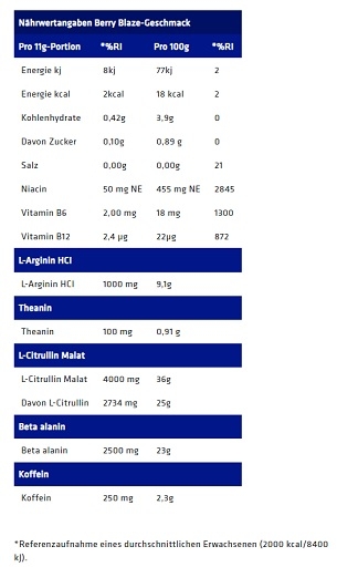 Ingrédients : L-citrulline-DL-malate (2:1) ; bêta-alanine ; polydextrose ; L-arginine HCl ; antiagglomérants : dioxyde de silicium, silicate de calcium ; arôme naturel ; caféine ; bicarbonate de potassium ; L-théanine issue d'extrait de feuille de thé vert (Camellia sinensis (L.) Kuntze) ; édulcorants : acésulfame-K, sucralose ; arôme ; extrait de spiruline (Arthrospira platensis) ; vitamine B3 (nicotinamide) ; citrate de trimagnésium ; extrait de poivre noir (Pipernigrum) ; vitamine B6 (pyridoxine HCl) ; vitamine B12 (cyanocobalamine).