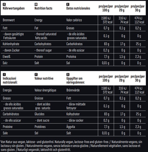 Le riz au lait est tout simplement LE repas avant ou après l'entraînement. Sans gluten, sans lactose, sans sucre, sans produits d'origine animale, sans additifs, facilement soluble et facilement digestible... On pourrait continuer ainsi indéfiniment. Les flocons fins peuvent être facilement préparés avec de l'eau tiède ou froide et garnis à votre goût. Les fruits frais, les noix, le lactosérum, l’isolat de protéines et nos produits Flav offrent des combinaisons de saveurs infinies ! Vous pouvez également déguster notre riz au lait instantané seul pour vous fournir des glucides de haute qualité avant votre entraînement. ou pour vous renforcer par la suite. Vous décidez de la consistance de votre snack, que vous pouvez mélanger sans fouet, juste avec une cuillère, aussi ferme ou aussi moelleuse que vous le souhaitez. Astuce : le riz au lait va gonfler un peu ! Souvent, de petites quantités d’eau ou de lait (végétal) suffisent.
