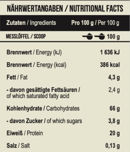 Maltodextrine, maïs cireux, concentré de protéines de lactosérum (issu du lait), farine d'avoine, poudre de cacao, arôme chocolat, édulcorant (sucralose).