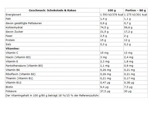 Maltodextrine, concentré de protéines de lactosérum 14 % (contient de la lécithine de tournesol comme émulsifiant et du phosphate de calcium comme antiagglomérant), fructose, cacao 4,5 %, exhausteur de goût et d'arôme glycine, glucose, isomaltulose - Palatinose™ (source de fructose et de glucose), fibres de blé sans gluten, stabilisants gommes d'acacia et de xanthane, arôme, antiagglomérants phosphate de calcium et dioxyde de silicium, prémélange de vitamines (acide L-ascorbique, acétate de DL-α-tocophéryle, nicotinamide, D-pantothénate de calcium, chlorhydrate de pyridoxine, riboflavine, mononitrate de thiamine, acide ptéroylmonoglutamique, D-biotine, cyanocobalamine), édulcorants sucralose et glycosides de stéviol. Peut contenir des traces de soja.