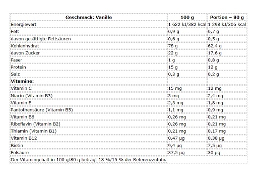 Mélanger une dose de 80 g (environ 3 mesures) avec 300 ml d’eau et consommer après une minute. Utiliser 1 à 4 doses par jour pour une alimentation variée. Une fois ouvert, conserver à une température ne dépassant pas 25 °C et consommer dans les 3 mois.