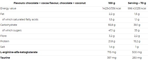 61 % de concentré de protéines de lactosérum, glucose, maltodextrine, cacao, fructose, 4 % d'isomaltulose - Palatinose™ (source de fructose et de glucose), fibres de blé sans gluten, L-glutamine, L-leucine, stabilisants gommes d'acacia et de xanthane, L-arginine alpha-cétoglutarate, L-isoleucine, L-valine, taurine, antiagglomérants phosphate de calcium et dioxyde de silicium, prémélange vitaminique (acide L-ascorbique, acétate de DL-α-tocophéryle, nicotinamide, D-pantothénate de calcium, chlorhydrate de pyridoxine, riboflavine, mononitrate de thiamine, acide ptéroylmonoglutamique, D-biotine, cyanocobalamine), édulcorants sucralose et Glycosides de stéviol, arômes. Le produit peut contenir des traces de soja.