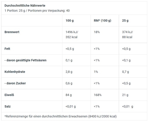 Teneur moyenne en acides aminés dans 1 portion (25 g) : acides aminés essentiels (histidine, isoleucine, leucine, lysine, méthionine, phénylalanine, thréonine, tryptophane, valine) : 9667 mg. Acides aminés semi-essentiels (arginine, cystéine, glutamine et acide glutamique, proline, tyrosine) : 6519 mg. Acides aminés non essentiels (alanine, acide aspartique, glycine, sérine) : 4564 mg. Teneur en BCAA : 4 533 mg.