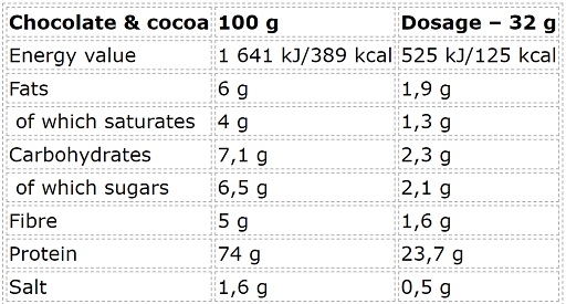 Concentré de protéines de lactosérum (contient de la lécithine de tournesol et un antiagglomérant phosphate de calcium), exhausteur de goût glycine, cacao, inuline, lait entier en poudre, épaississant xanthane, édulcorants acésulfame K et sucralose, chlorure de sodium, antiagglomérant dioxyde de silicium, arôme. Peut contenir des traces de soja. 100 g/32 g contiennent : Énergie - 1641 kJ/388 kcal/525 kJ/124 kcal - Matières grasses - 6 g/1,9 g - dont acides gras saturés - 4 g/1,3 g - Glucides - 7,1 g/2,3 g - dont sucres - 6,5 g/2,1 g - Fibres - 5 g/1,6 g - Protéines - 74 g/23,7 g - Sel - 1,6 g/0,5 g. Si la dilution recommandée est respectée, la boisson est pauvre en sucre, soit < 2,5 g/100 ml.