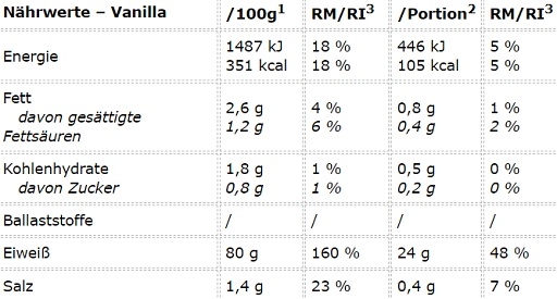 Isolat de protéines de SOJA 44 %, isolat de protéines de lactosérum microfiltré à flux croisé 22 %, concentré de protéines de lactosérum ultrafiltré 22 %, L-leucine 5 %, hydrolysat de protéines de lactosérum 3 %, arôme, sel, épaississant (gomme xanthane), édulcorants (sucralose, acésulfame K), mélange de vitamines (acide L-ascorbique, nicotinamide, acétate de DL-alpha-tocophéryle, D-pantothénate de calcium, mononitrate de thiamine, riboflavine, chlorhydrate de pyridoxine, acide ptéroylmonoglutamique, D-biotine, cyanocobalamine), émulsifiant (lécithines (SOJA)), lactase (d'Aspergillus oryzae).