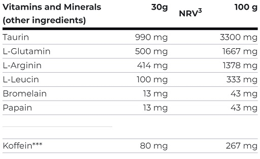 Protéine de lactosérum instantanée 85 % {concentré de protéines de lactosérum (lait) [émulsifiant : lécithines (soja)], isolat de protéines de lactosérum (lait) [émulsifiant : lécithines (soja)]}, arômes, taurine 3,3 %, poudre de yaourt (lait), L-arginine 1,7 %, L-glutamine 1,7 %, sel, épaississant (gomme xanthane), édulcorants (acésulfame K, sucralose), L-leucine 0,3 %, antiagglomérant (dioxyde de silicium), bromélaïne dérivée de l'ananas 0,07 % (1200 GDU/g), papaïne dérivée de la papaye 0,07 % (1,5 FIP U/mg).