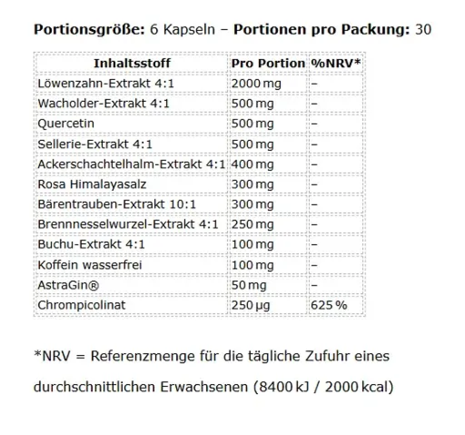Extrait de pissenlit [Taraxacum officinale] (racine) 4:1, extrait de genévrier [Juniperus communis] (fruit) 4:1, extrait de quercétine dihydratée, extrait de céleri [Apium graveolens] (graine) 4:1, extrait de prêle [Equisetum arvense] (plante) 4:1, sel rose de l'Himalaya, extrait de busserole [Arctostaphylos uva-ursi] (feuille) 10 %, extrait d'ortie [Urtica dioica L.] (feuille) 4:1, extrait de buchu [Agathosma betulina] (feuille) 4:1, caféine anhydre, AstraGin® (Panax notoginseng, Astragalus membranaceus), picolinate de chrome, enveloppe de la capsule végétale (hydroxypropylméthylcellulose), stéarate de magnésium (végétal), dioxyde de silicium.