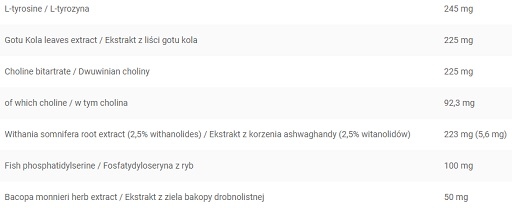 Complexe d'extraits de feuilles de thé vert [45 % EGCG, 90 % polyphénols, 40 % caféine] (Camellia sinensis (L.) Kuntze), enveloppe de la gélule blanche [colorant (E171), gélatine], enveloppe de la gélule en gélatine, agent de charge (E460(i)), extrait de racine de pissenlit (Taraxacum officinale Web), L-tyrosine, extrait de feuille de gotu kola (Centella asiatica (L.) Urban), bitartrate de choline, pectine de pomme, extrait de racine de Withania somnifera (2,5 % de withanolides) (Withania somnifera (L.)), extrait de racine de gingembre (5 % de gingérols) (Zingiber officinale Rosc.), extrait de racine de busserole (Arctostaphylos uva-ursi) L.), extrait de feuille de maté (Ilex paraguariensis A. St.- Hil.), amidon, extrait de noix de cola (graine) (Cola acuminate (P.Beauv.) Schott Et Endl), enveloppe de capsule rouge [eau, gélatine, colorants (E171, E122 - peuvent altérer l'activité et l'attention chez les enfants)], extrait de racine d'ortie (Urtica dioica L.), phosphatidylsérine de poisson, extrait de cosse de psyllium (Plantago afra L.), caféine anhydre, extrait de feuille d'olivier (Olea europaea L.), extrait de graine de guarana (22 % de calcium) (Paullinia cupana Kunth), extrait de feuille de thé noir (20 % de théaflavines) (Camellia sinensis (L.) Kuntze), extrait de racine de Panax ginseng (Panax ginseng C.A. Mey.), extrait de pamplemousse (Citrus paradisi Macfad.), extrait de grain de café vert (50% ACG) (Coffea arabica L.), extrait de Bacopa monnieri (Bacopa monnieri (L.) Wettst.), extrait d'écorce de cannelle (Cinnamomum verum J.Presl.), extrait de racine de bardane (Arctium lappa L.), extrait de graines de céleri (Apium graveolens L.), extrait de baies de genévrier (Juniperus communis L.), quercétine, racine de ginseng sibérien extrait (Eleutherococcus senticosus (Rupr. et Maxim.) Maxim), extrait de graines de Piper nigrum (95% pipérine) (Piper nigrum L.), extrait de feuilles de Salvia offcinalis (Salvia offcinalis L.), extrait de fruit de poivre de Cayenne (1% capsaïcine) (Capsicum annuum L.), agent de charge (E341), antiagglomérants (E551, E470b).