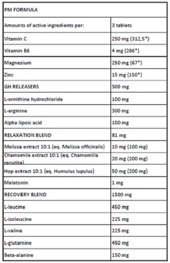 Agents de charge (E460(i), E341, E464), protéines de lactosérum (issues du lait), oxyde de magnésium, L-arginine, vitamine C (acide L-ascorbique), BCAA 2:1:1 (L-leucine, L-isoleucine, L-valine), bêta-alanine, stabilisants (E1202, E470b), monochlorhydrate de L-ornithine, L-glutamine, acide alpha-lipoïque, extrait de camomille (Chamomilla recutita (L.) Rauschert), extrait de fleur de houblon (Humulus lupulus L.), extrait de feuille de mélisse (Melissa offcinalis L.), oxyde de zinc, vitamine B6 (chlorhydrate de pyridoxine), mélatonine, antiagglomérants (E551, E553b), agent d\'enrobage (E1521), colorants (E150c, E129, E102, E153). E129, E102 - Peut avoir un effet négatif sur l\'activité et l\'attention des enfants.