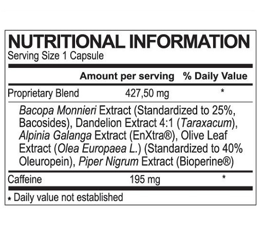 Ingrédients : Extrait de Bacopa Monnnieri (Standardisé à 25%, Bacosides), Extrait de Pissenlit 4:1 (Taraxacum), Extrait d'Alpinia Galanga (EnXtra), Extrait de Feuille d'Olivier (Olea Europaea L.) (Standardisé à 40% d'oleuropéine), Extrait de Piper Nigrum (Bioperine ), Caféine, Antiagglomérant (stéarate de magnésium, dioxyde de silicium), cellulose microcristalline.
