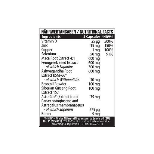Extrait de racine de maca, extrait de graines de fenugrec, extrait de racine d'ashwagandha (KSM-66®), hydroxypropylméthylcellulose, gluconate de zinc, poudre de brocoli, extrait de racine de ginseng de Sibérie, antiagglomérant (sels de magnésium d'acides gras, dioxyde de silicium), tétraborate disodique décahydraté, extrait de Panax notoginseng et d'Astragalus membranaceus (AstraGin®), levure de sélénium, gluconate de cuivre(II), cholécalciférol.