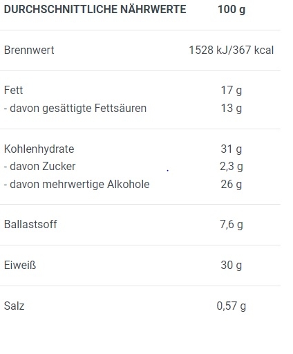 Saveur : Double chocolat : humectants (maltitol, glycérine), enrobage [édulcorant (maltitol), graisses végétales entièrement hydrogénées (noix de coco, colza), cacao maigre en poudre, émulsifiant (lécithine)], concentré de protéines de lactosérum, concentré de protéines de lait, fructo-oligosaccharides, collagène hydrolysé, huile de coco raffinée, cacao maigre en poudre, isolat de protéines de lactosérum [isolat de protéines de lactosérum, émulsifiant : lécithines (soja)], eau potable, farine d'amande, émulsifiant : lécithines (soja), agent de charge (carraghénane), arômes, conservateur (sorbate de potassium), stabilisant (chlorure de potassium), antioxydant (alpha-tocophérol), édulcorant (sucralose).