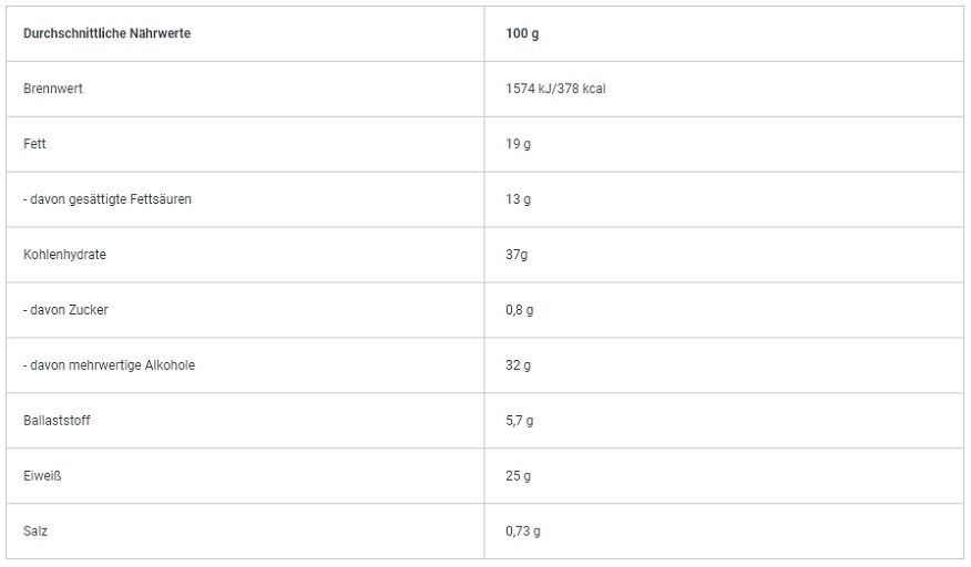 Humectants (maltitol, glycérine), enrobage [édulcorant (maltitol), graisses végétales entièrement hydrogénées (noix de coco, colza), cacao maigre en poudre, émulsifiant (lécithine)], protéines de riz (contient du soja), protéines de pois, huile de coco raffinée, fructo-oligosaccharides, cacao maigre en poudre, soja extrudé, eau potable, émulsifiant : lécithine, farine d'amande, arômes, gélifiant (carraghénane), conservateur (sorbate de potassium), stabilisant (chlorure de potassium), antioxydant (alpha-tocophérol). Produit dans une usine qui manipule du lait, des œufs, du soja, des crustacés, du dioxyde de soufre et des noix. Sans gluten selon les dispositions de l'Union européenne.