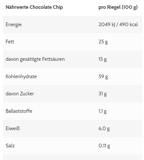 à l'avoine 32 %, enrobage au chocolat noir 18 % (sucre, huile de palme, cacao maigre en poudre, émulsifiant (lécithines (tournesol)), polyricinoléate de polyglycérol), arôme), huile végétale (huile de palme, huile de colza), sirop de canne à sucre, pépites de chocolat 10 % (pâte de cacao, sucre, beurre de cacao, cacao maigre en poudre, émulsifiant (lécithines (soja))), sucre, humectant (glycérol), farine de soja.