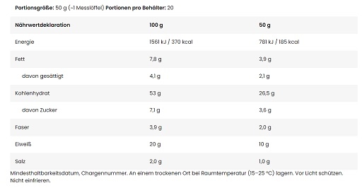 Farine de blé, flocons d'avoine, lait entier en poudre, concentré de protéines de lactosérum (de lait), cacao, farine d'avoine, levure chimique [agents levants (diphosphates, carbonates de sodium), farine de blé, huile de colza], sel, arôme, édulcorant (sucralose).