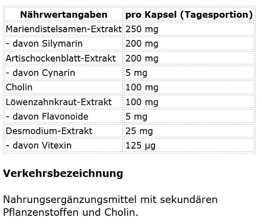 Une capsule de MARIENDISTEL Complex contient 250 mg d'extrait de chardon-Marie en association avec 200 mg d'extrait d'artichaut, 100 mg d'extrait de pissenlit et 25 mg d'extrait de desmodium (herbe du mendiant). Les 4 extraits de plantes de haute qualité sont judicieusement complétés par de la choline, une substance semblable à une vitamine. La choline est un nutriment semi-essentiel et contribue au fonctionnement normal du foie.