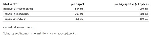 Cette composition impressionnante fait de la Crinière de Lion un véritable concentré de champignons. Pour nos gélules, nous utilisons un extrait 30:1 de haute qualité, qui présente non seulement une teneur exceptionnellement élevée en polysaccharides (30 %), mais aussi 5 % de bêta-glucane.