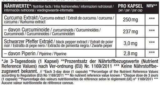 Extrait de curcuma, enveloppe de la capsule hydroxypropylméthylcellulose, agent de charge cellulose microcristalline, extrait de poivre noir
