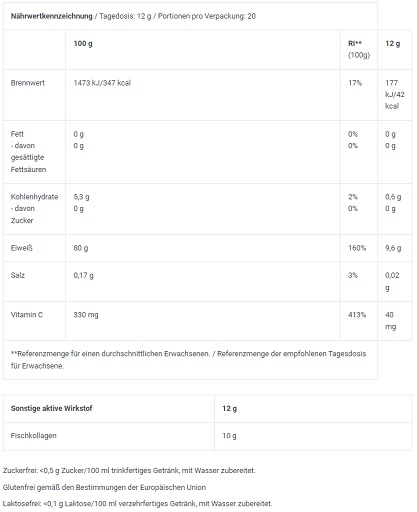 Collagène de poisson hydrolysé 84%, arômes, acidifiants (maltodextrine, acide citrique), agent de charge (polydextrose), diluant (sucralose), vitamine C (acide L-ascorbique), concentré de maltodextrine [maltodextrine, concentré de maltodextrine, acidifiant (acide citrique)], colorants (carotènes, complexes cuivriques de chlorophylle et de chlorophylle), sel de table.